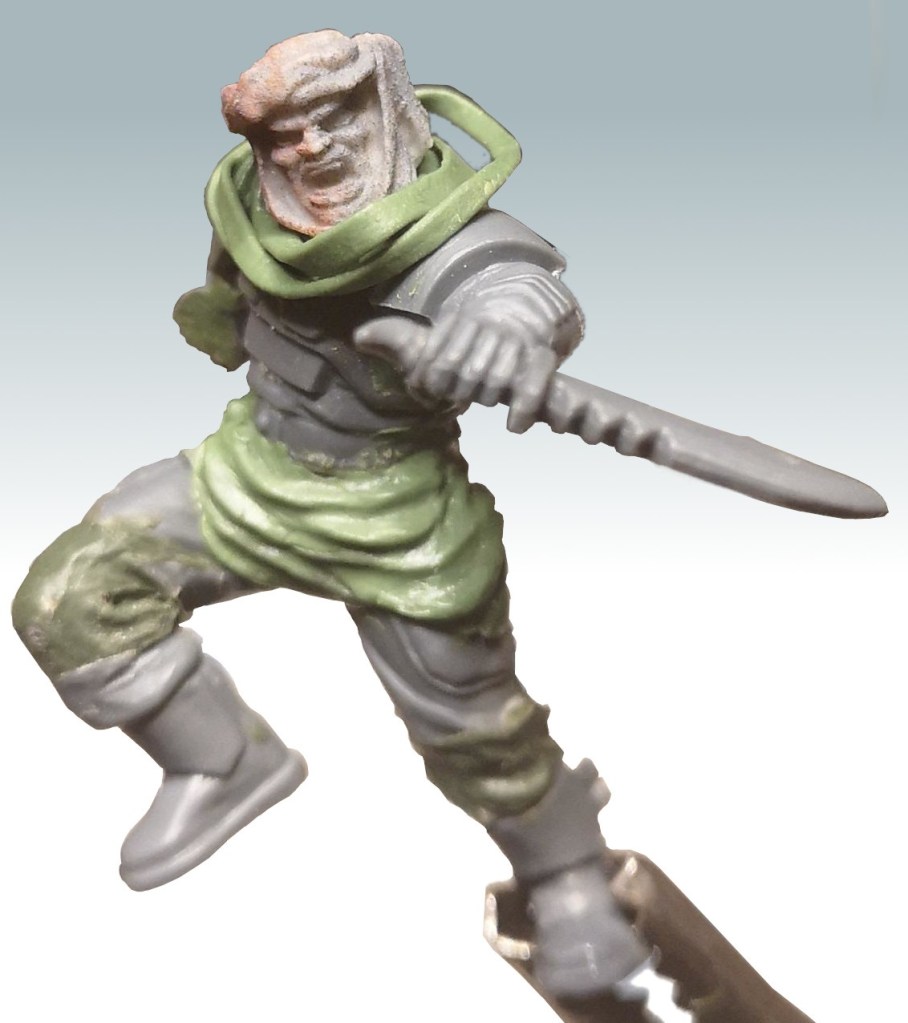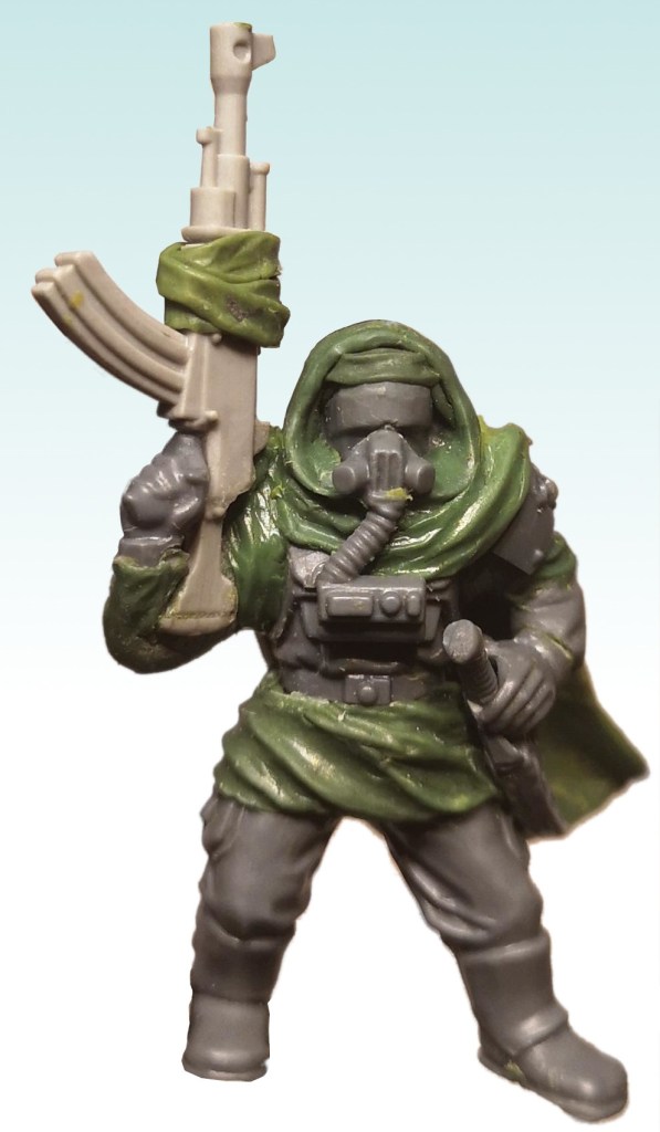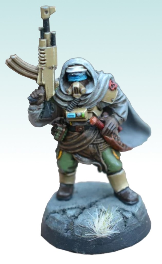 A fun conversion of a regular guardsman charging (and likely dieing). Really wanted to capture the “swift as wind rule” with this very Eldar looking pose. Made with cadian bits, puppetswar head and a chaos dagger. A variety of puppetswar heads are used along with maxmini heads to speed up the process while adding diversity. Diversity in the models was essential for me, so there’s a smattering of custom poses and the injection catachan legs to speed up the process. I use cadian bits primarily because long sleeves to protect from the brutal sun on desert planet(s) just made sense to me and I always liked the look of the armour. They do have a 5+ save after all. The final paint scheme for the infantry is very reminiscent of the classic scheme with drab desert colours with pop of green.