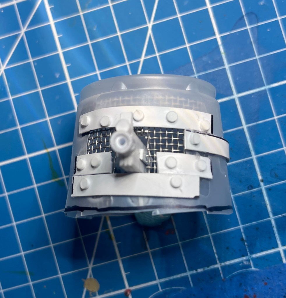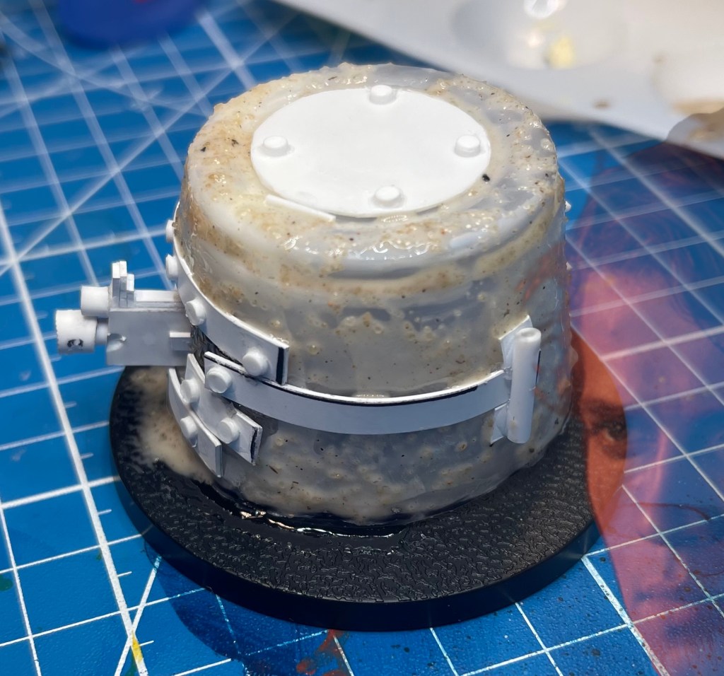 The slick sides of the cups looked like they were going to present an issue for the planned concrete texture. The classic method used by model tank hobbiests is to take some liquid poly cement and stipple it with an old brush. Lacking any liquid poly cement, I opted for a more ready at hand household item mixture using some Elmer’s white glue thinned down with water and some sand. Despite the coarse and irritating nature of sand, it does add quite a bit of texture to an otherwise slick painting surface.