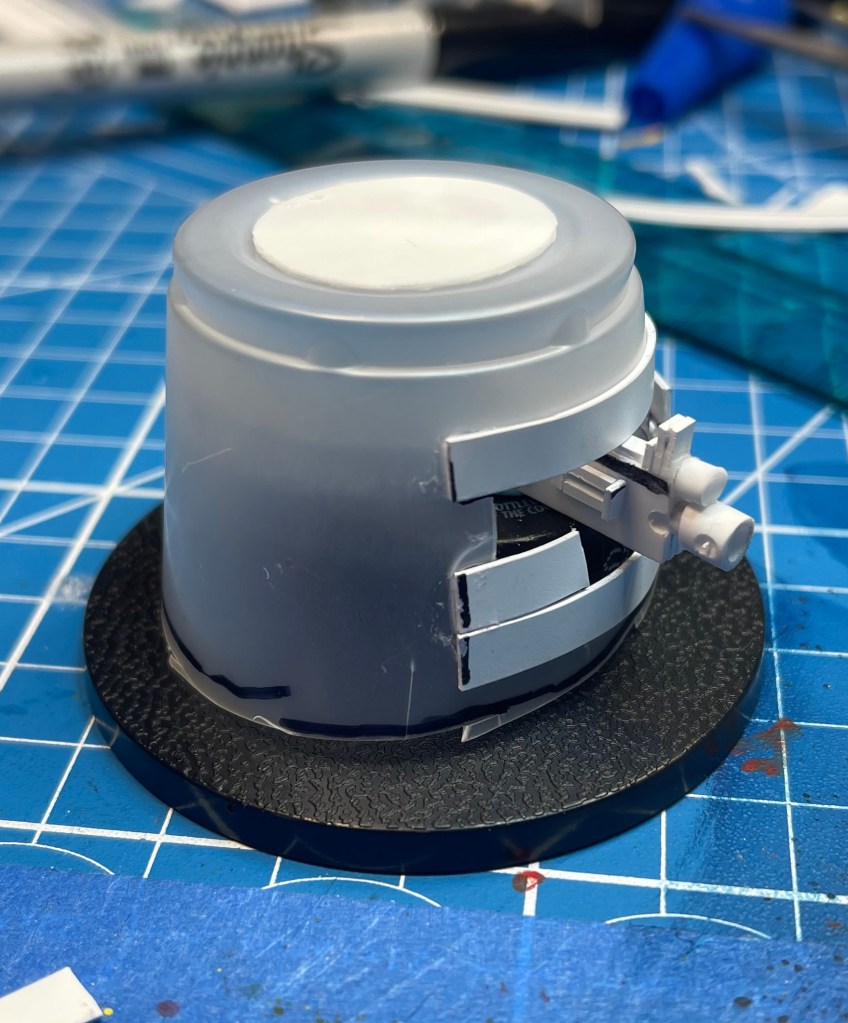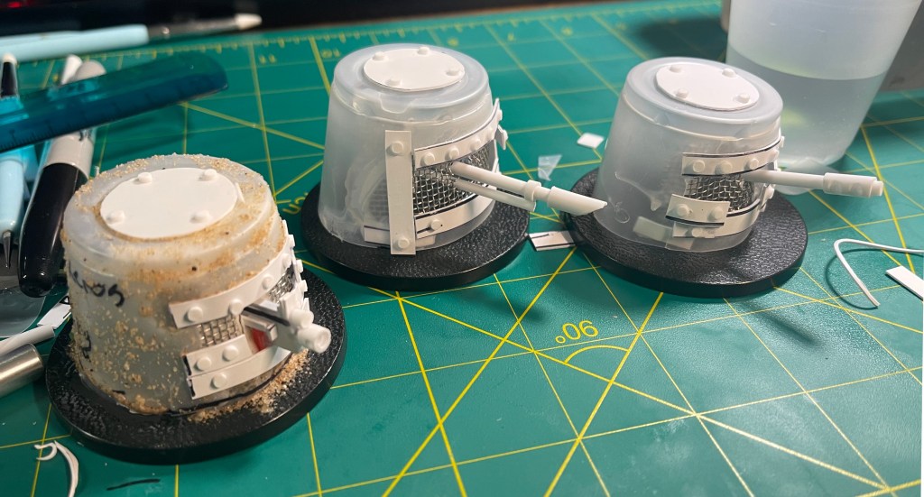 While I waited on the mixture to dry I assembled the other two weapons. A lascannon and autocannon. Both made entirely of plasticard rods.