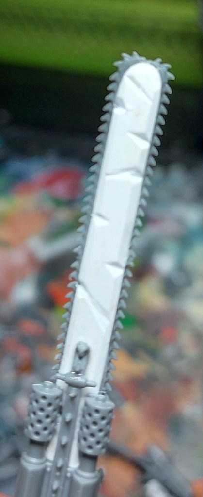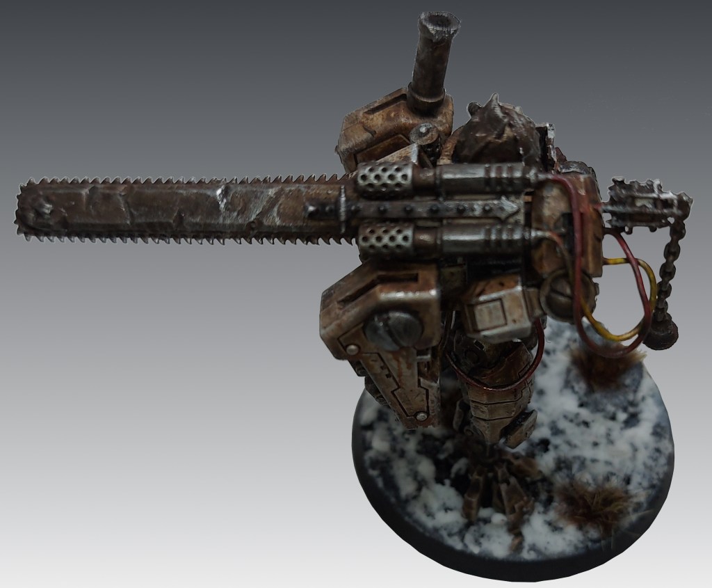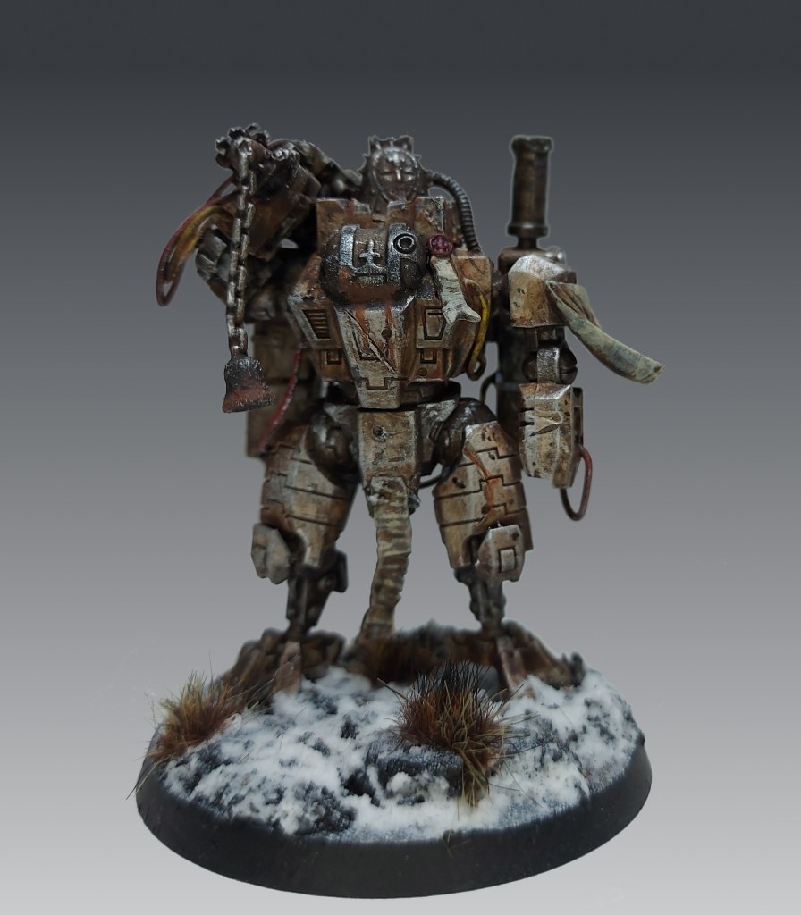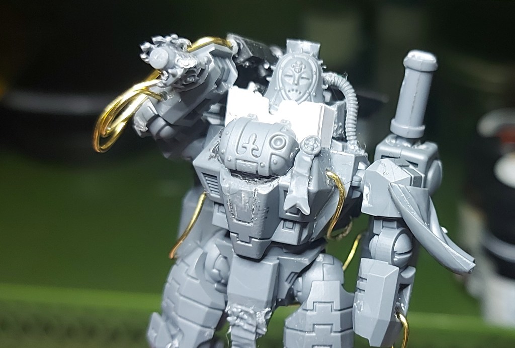 The actual conversion of the suit incorporates pieces of 40k Sisters of Battle and Ork pieces to create the head.