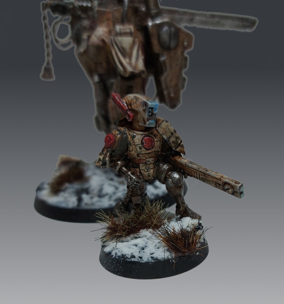 “After settling on tau, I started to picture a crisis team that had been stranded by some device, probably a warp storm, on the frozen world of gelida. They’re far from the brainwashing of the Water Caste, have since renounced the greater good, taken off their tau iconography and embraced the Gelidan way of life, becoming something of devotees to the Imperial Cult on the world.”