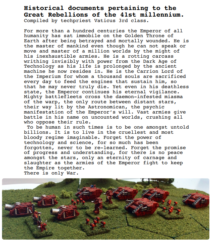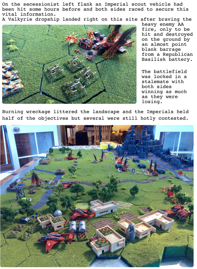 Epic is a game system that is perfect for representing the massive scale of combat in Warhammer 40,000. Marcus Machiavelli has taken full advantage of that with a multi-part, planet wide Epic campaign. His battlefields are full of custom crafted explosions, smoke effects, and terrain (which will be given a closer look in a separate post) through which masses of troops of the Imperium fight against traitorous rebels.