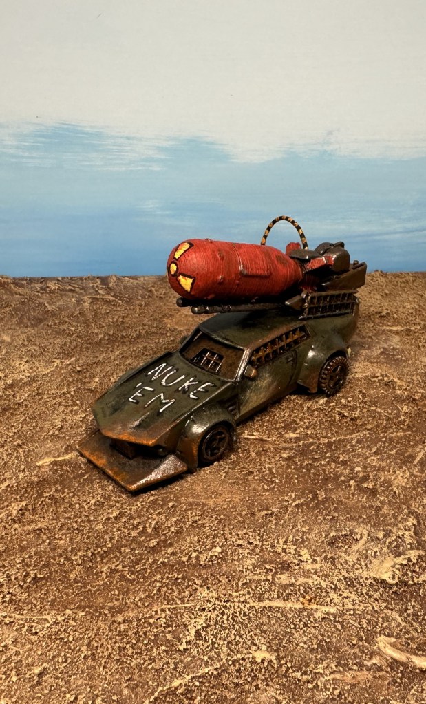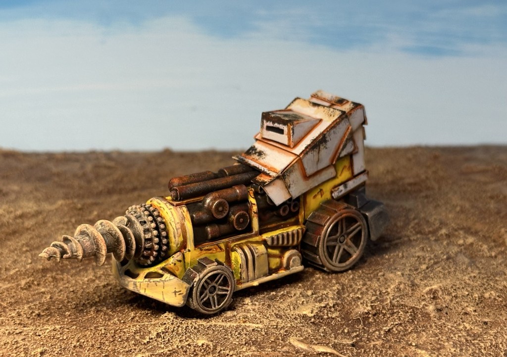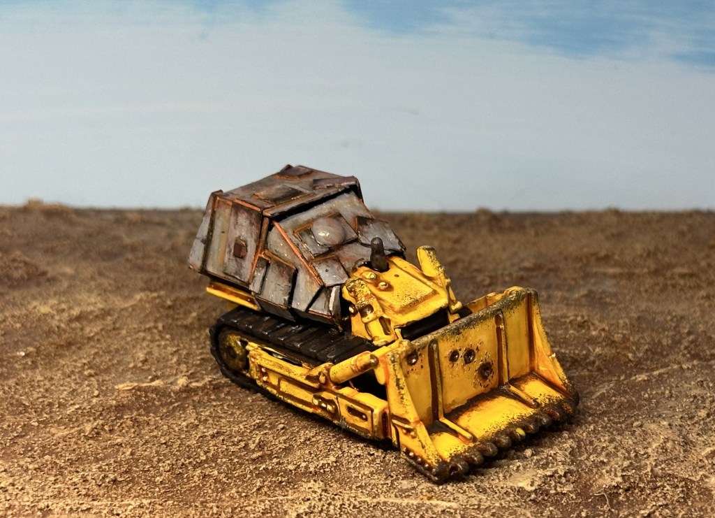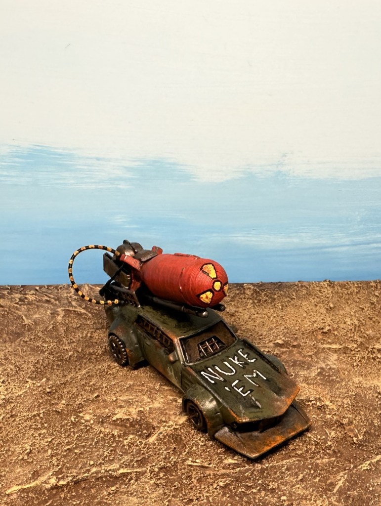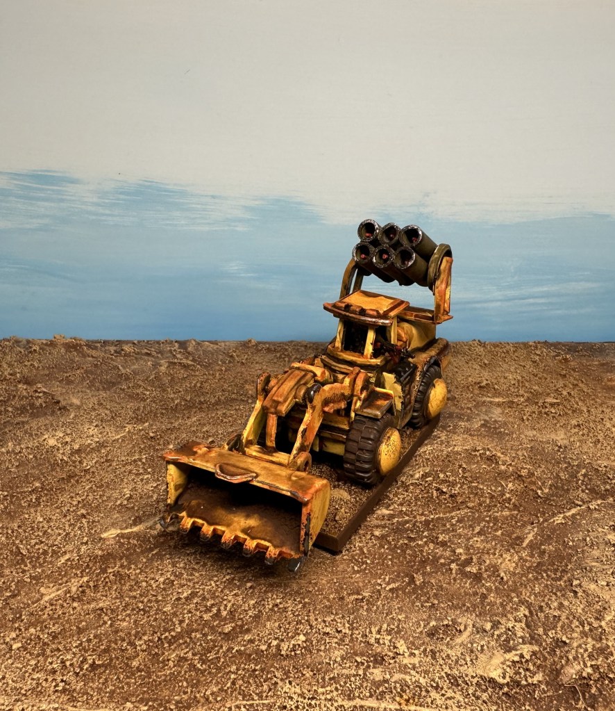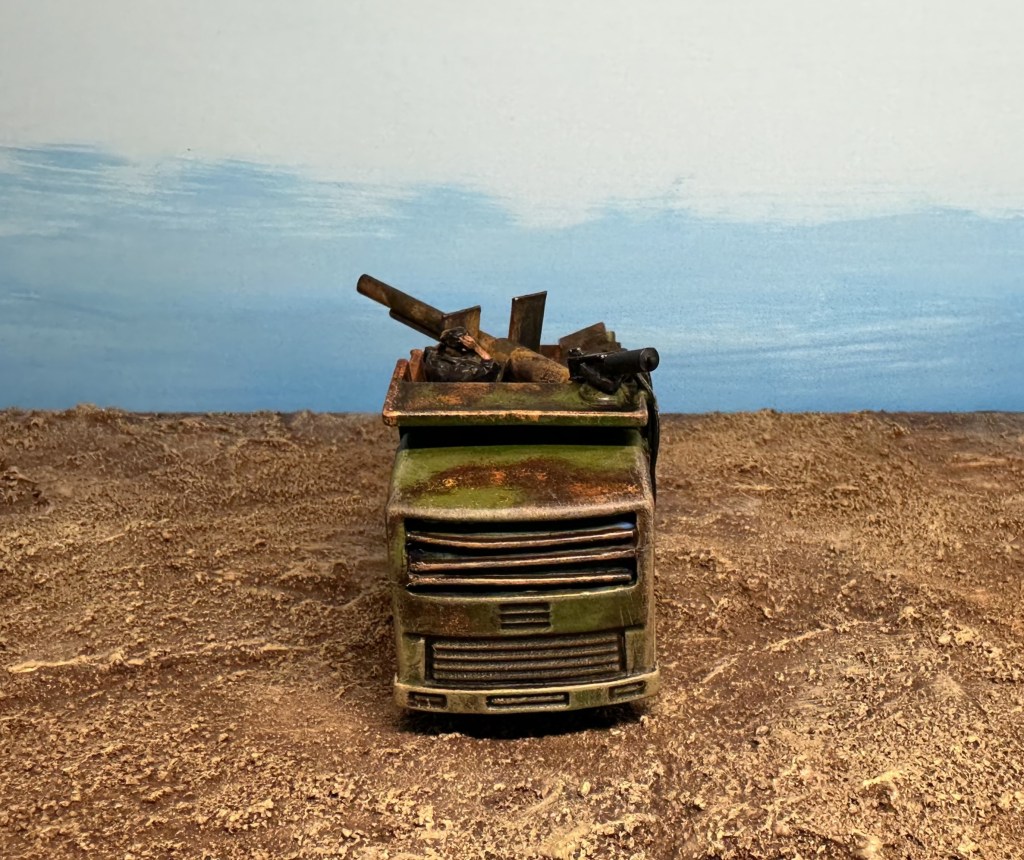 A pair of construction vehicles blued together and with a tank turret on top to create a super heavy wasteland tank is one of my favorite builds. I had a lot of 1/72 scale military figures from other projects, so they started appearing as drivers and crew in vehicles, replacing the 3D printed gasmask guys.