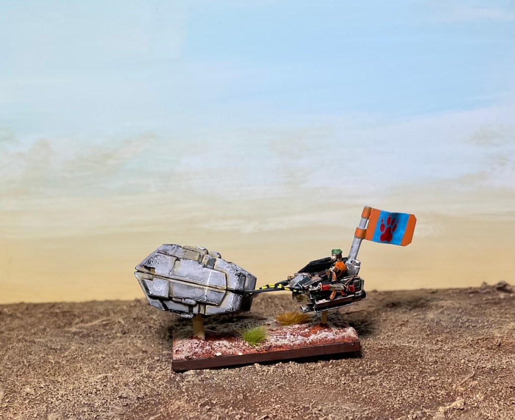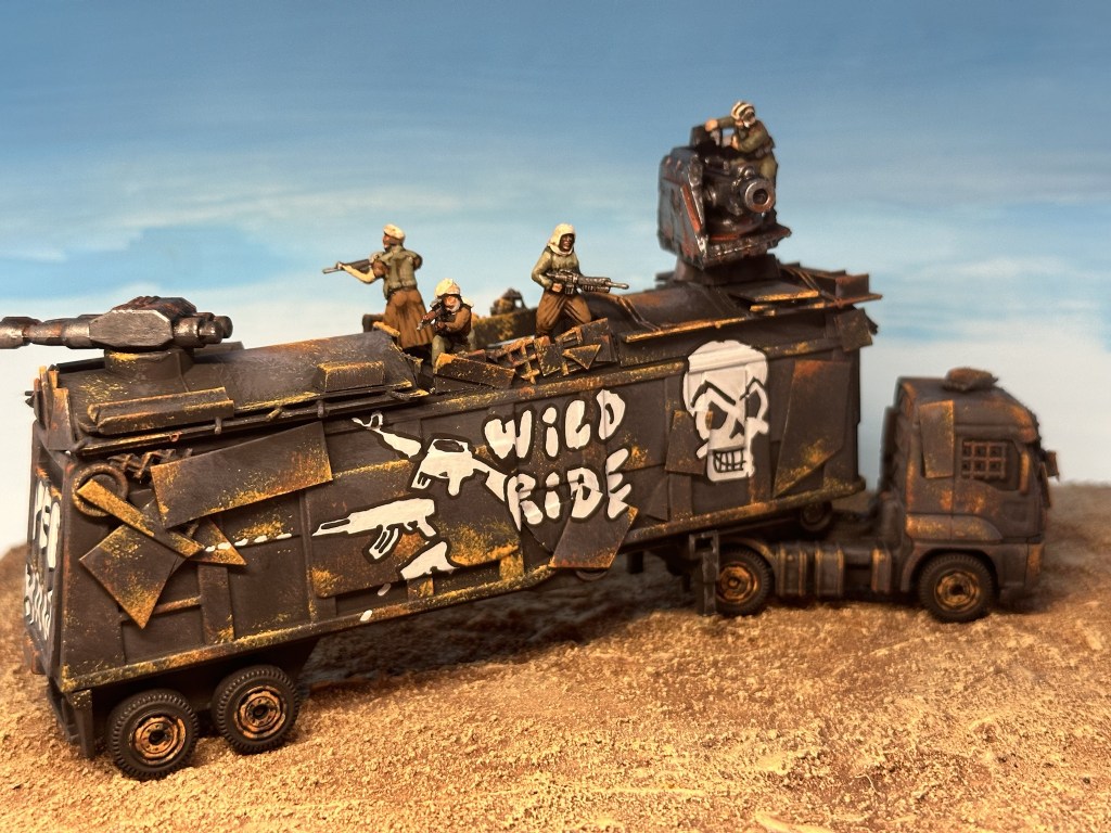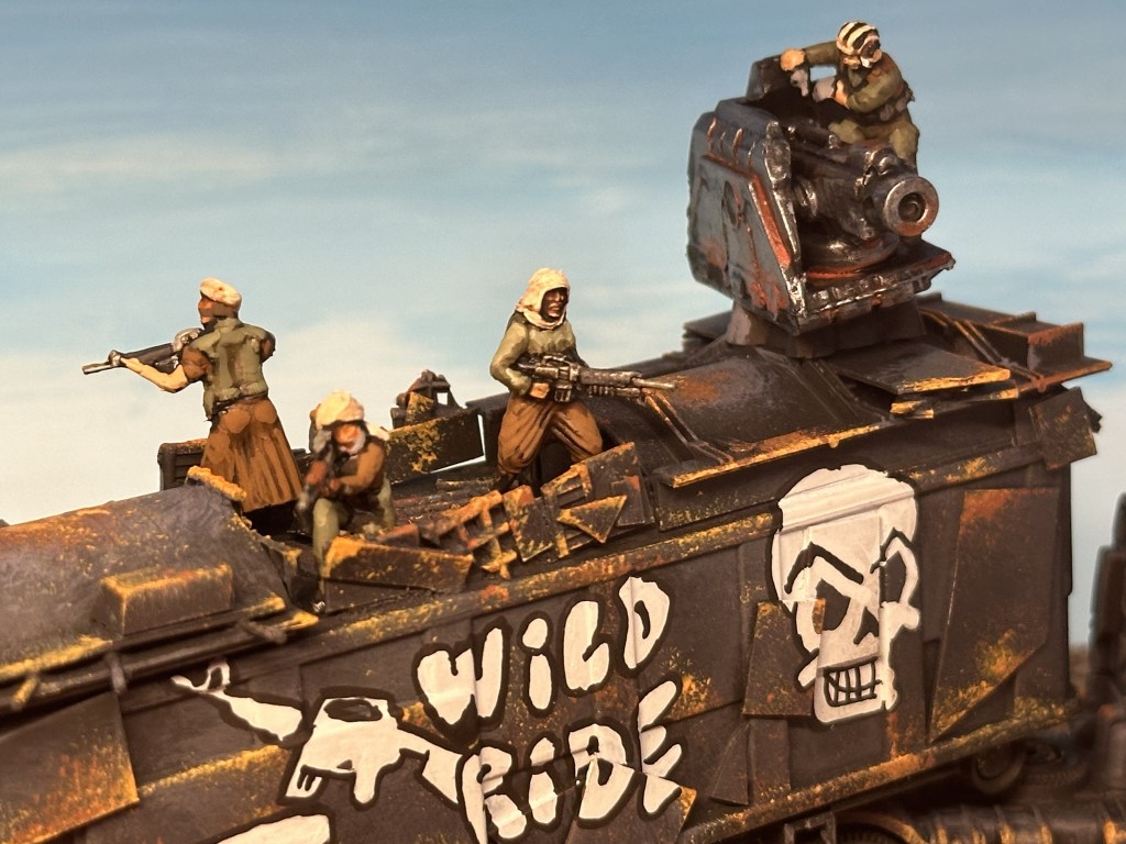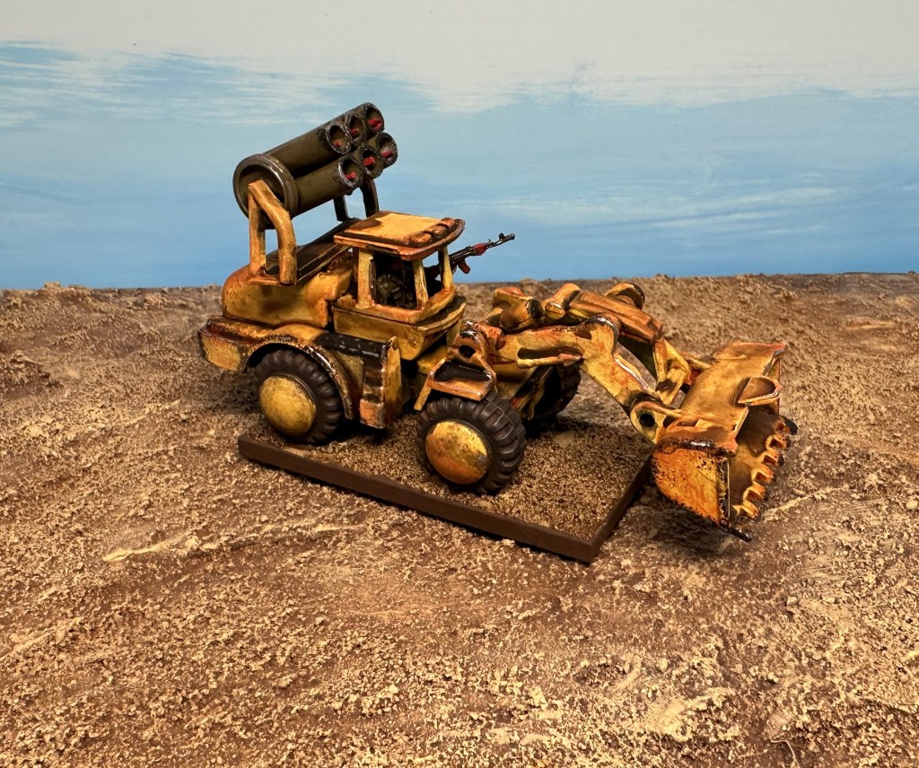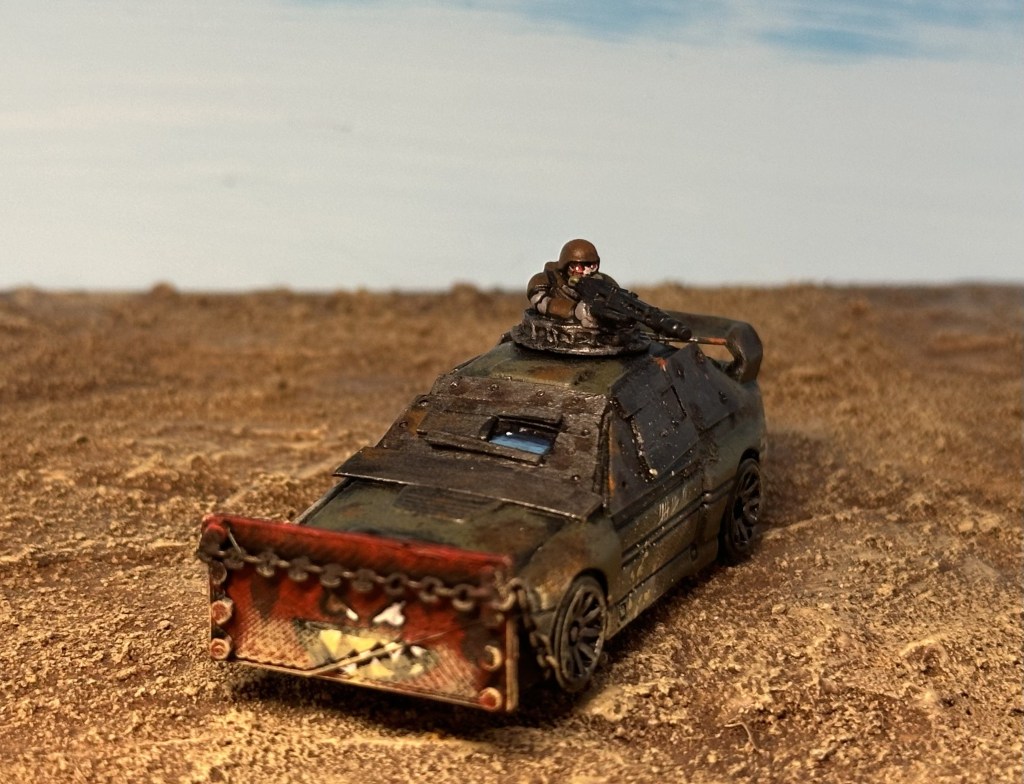 A pair of construction vehicles blued together and with a tank turret on top to create a super heavy wasteland tank is one of my favorite builds. I had a lot of 1/72 scale military figures from other projects, so they started appearing as drivers and crew in vehicles, replacing the 3D printed gasmask guys.