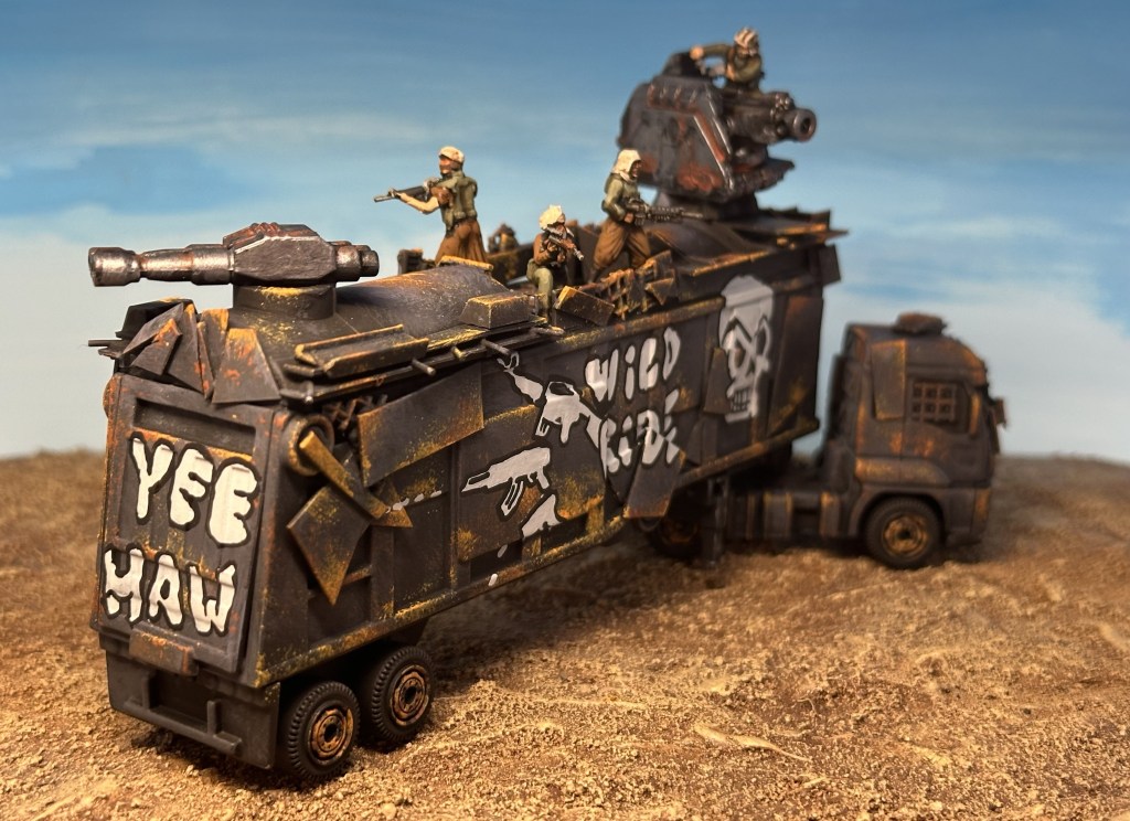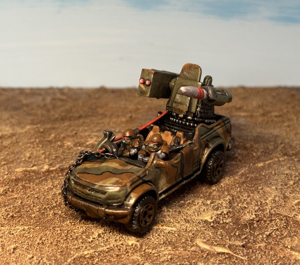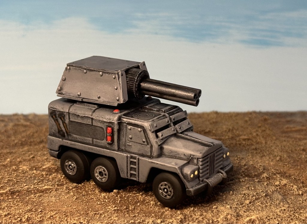 I’m currently working on two cars, a grey truck a massive rotary gun, and a flame spewing pro-pain truck.