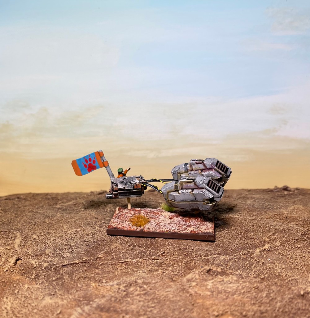 All grey vehicles, which I imagined belonged to a cult that worship the giant head on the tank as their god.