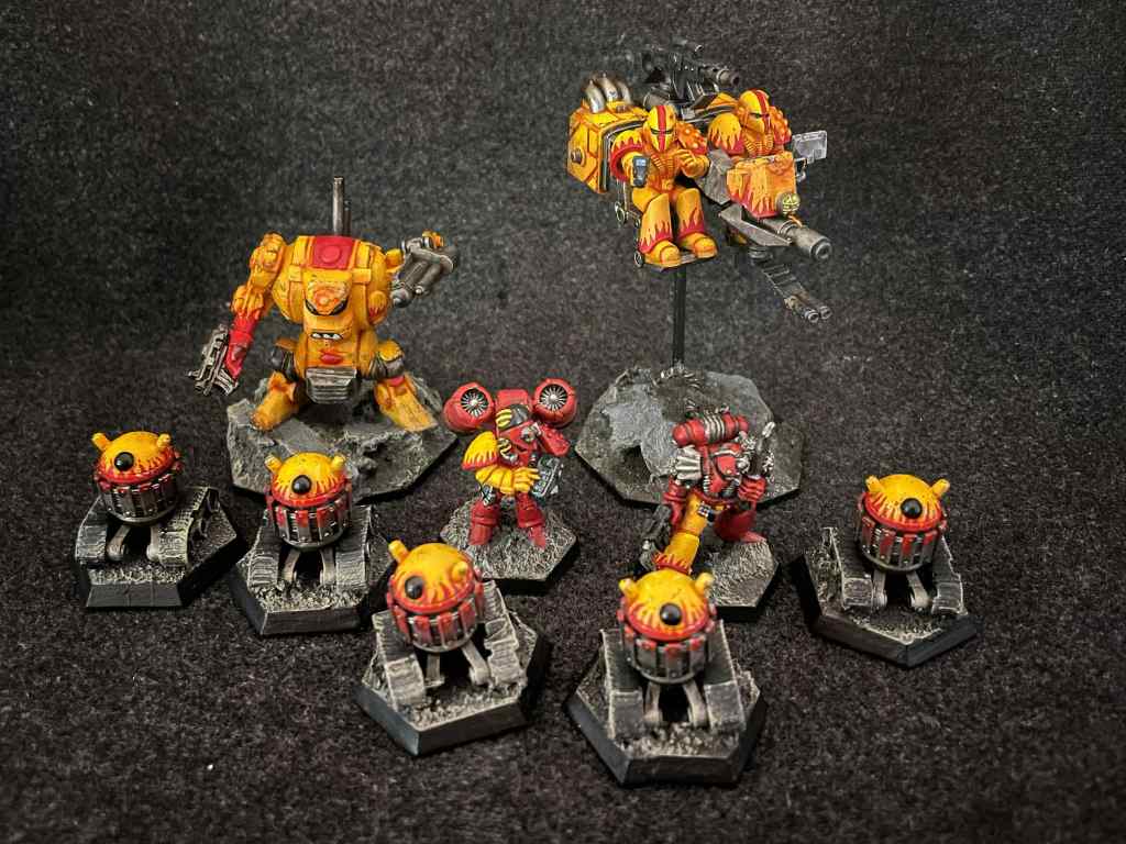 Below are marines I believe are painted as Fire Hawks, accompanied by robot miniatures I truly can not identify.