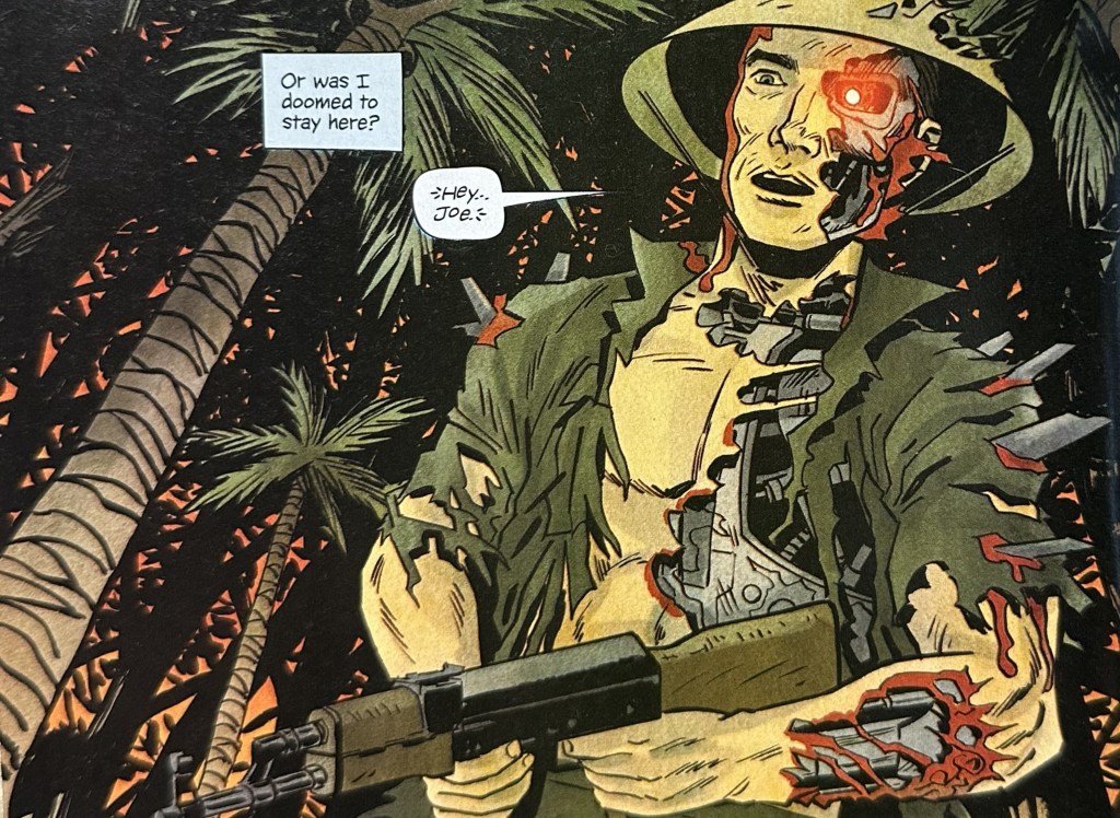 The premise of the comic has some distance from the cover. While there is indeed a terminator story inside, it takes place in the Vietnam war. The plot, such as it is, is in this opening issue quite thin. A US soldier is in a city in Vietnam that the US is pulling out of, and he goes AWOL to get his hidden treasure (very clumsily foreshadowed to be a secret wife). On the way he encounters a terminator that has come back in time and has found itself embroiled in a fight against the Viet Cong it has stumbled across.
