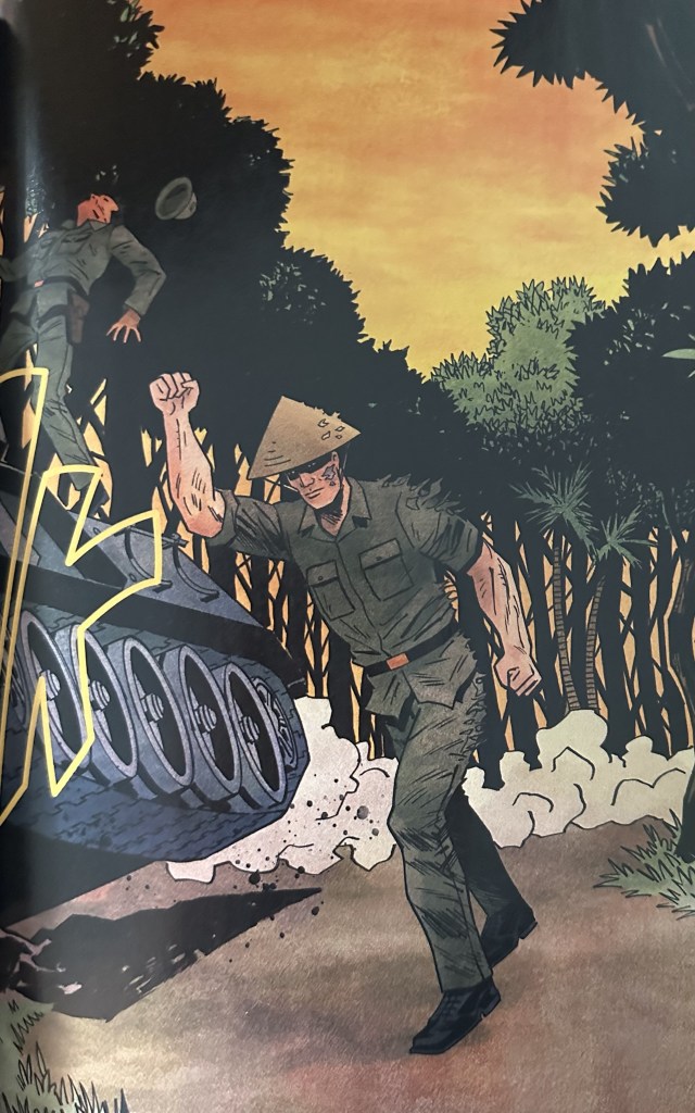 Sometimes the flat quality wraps back around into looking like inentional stylization, such as the panel below of Viet Cong firing at the terminator, which looks like a medieval tapestry if you squint hard enough.
