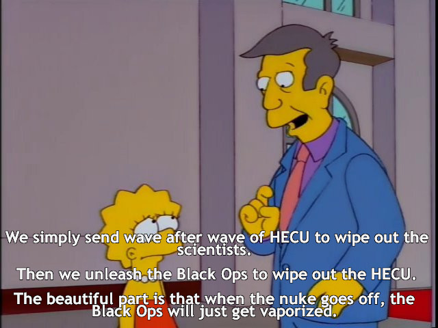 The black ops serve as constant foes as they further a plot to place and activate a nuclear weapon with the goal of wiping out the entire area as their superiors have declared the HECU attempt to contain the situation a failure. I actually killed the black ops guarding the nuke and disabled before talking to the security guard that would have warned me about it, making the moment somewhat anti-climactic.