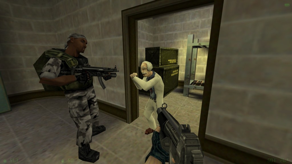 This narrative handwave neatly scoots past making the player feel bad about their role at Black Mesa, although it also loses some of the attitude and distinction compared to Gordan Freeman from the original game. In both games, the player is aided by both scientists and security guards against aliens and evil black ops. There are only a few instances of HECU roughing up scientists and they are much toned down from the original game where troops would gleefully mow down scientists.