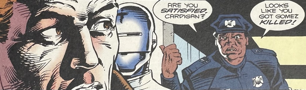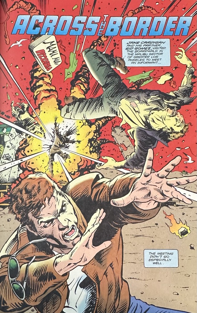 Without dwelling too long on the cover, I’ll get inside of of this issue, which is referred to as both ‘City Of Devils’ and ‘Across The Border’ by different websites. The first page starts with a bang. Jake and his investigative partner Gomez walk into a trap as human appearing androids loaded with explosives get close and detonate.