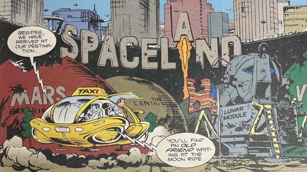 On his way to start the assignment, Jake is taken against his will on a short side trip to meet a mysterious “old friend” at the defunct Spaceland museum. I do like dilapidated future locations.