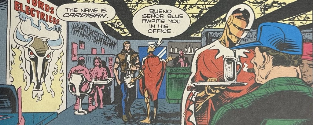 At Cosmos, Jake’s boss Walt Bascom fills him in on what the plot is going to be. A Dr. Kittridge and his daughter Beth were working on an “anti-tek” system (and no I don’t exactly know what that means), and both of them have disappeared in Mexico. Likely the dong of the powerful teklord cartels. The way Beth is drawn has some strange Rob Liefeldian qualities. The stiff pose and strangely almost painted on dress that somehow clings hard enough to show the belly button are unnecessarily surreal. Bascom’s crazy eyes while explaining the situation don’t help either.