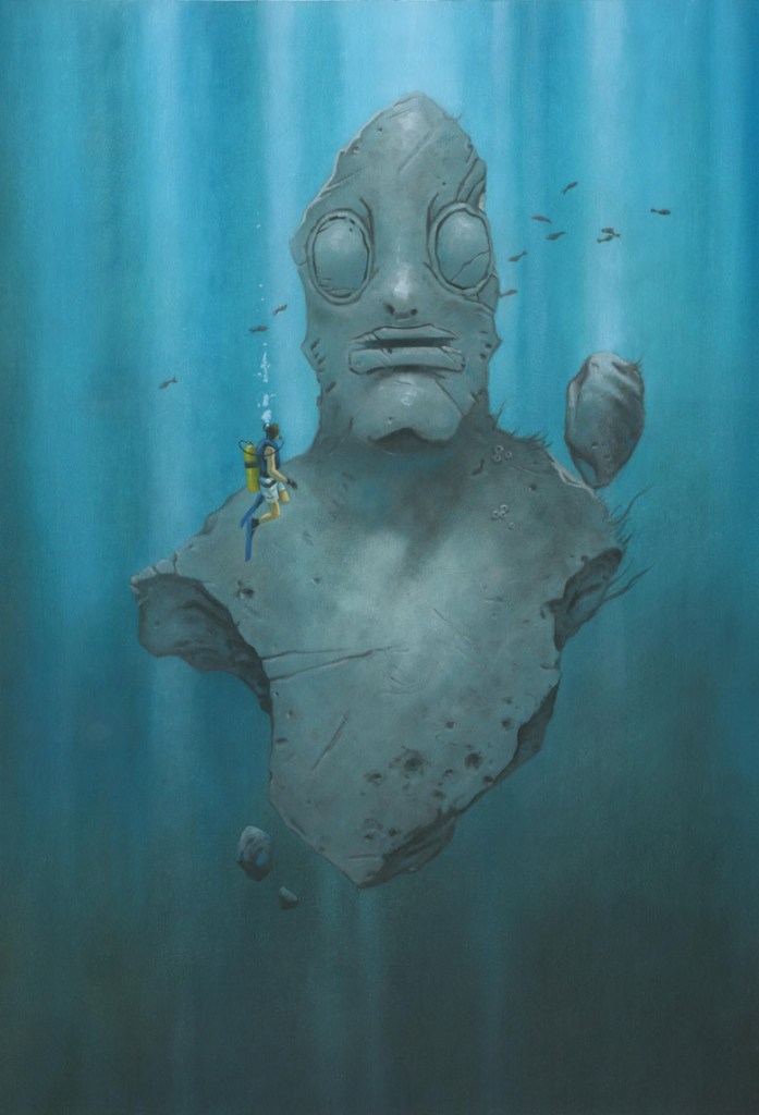 Many of her works have scifi or horror tones to them. My eye was caught by this oil painting of an ominous Lovecraftian image of an underwater stone statue that is somehow simply existing in the middle of the depths. Is it an image of Dagon? A Deep One? Something else entirely? Who knows. The addition of a scuba diver gives the statue scale, and sets the time period as something more modern that classic Lovecraft tales. This is a great mysterious piece that feels like it should be the cover of a Call Of Cthulhu module book.