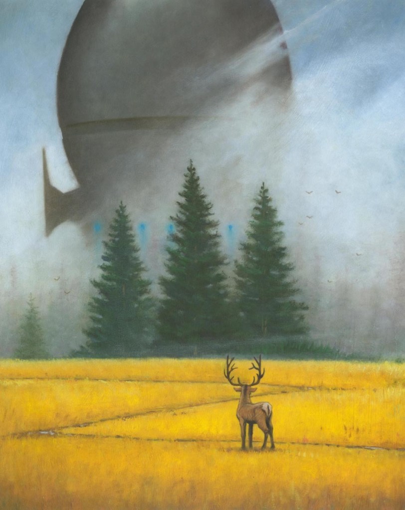 An equally evocative but of a different tone, this image shows fog obscured starships being observed by a lone deer. The zee-rust design of the ships calls to mind classic scifi of the 1950s or 60s. There is no clue as to the nature of the pilots. Are they human or alien? Is this first contact for earth, or the routine lift off of a manmade vessel?