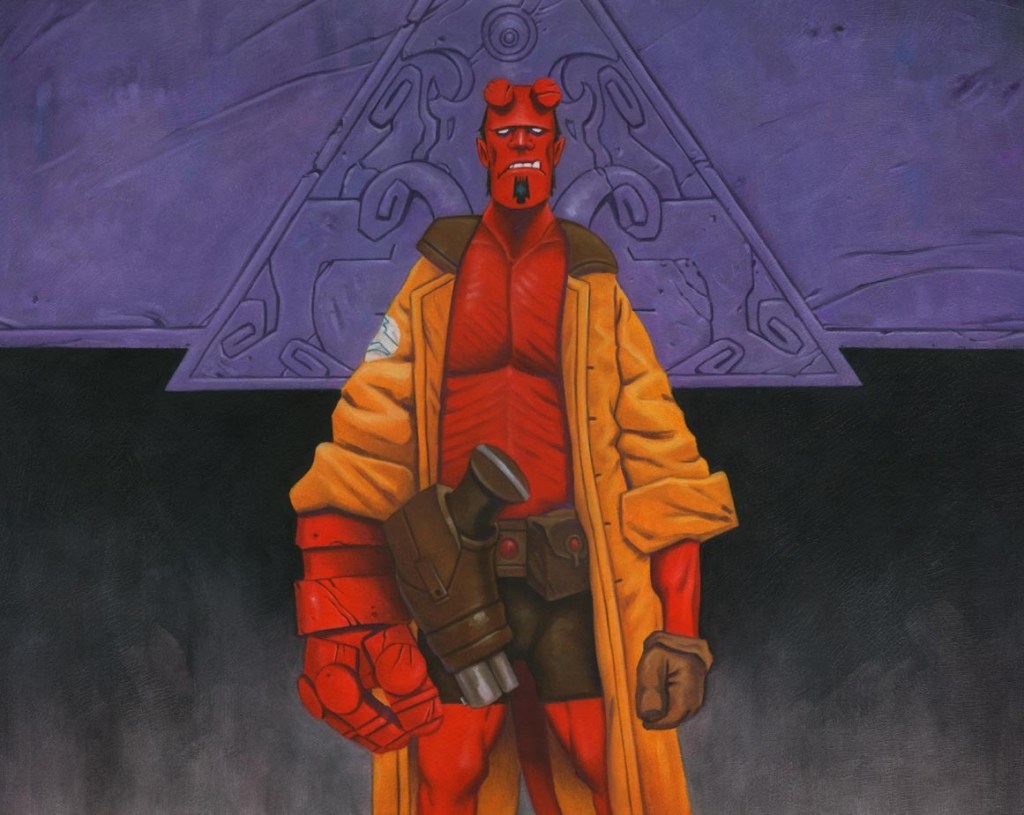 The last example is Stacy’s take on Hellboy. Many of her other works include Lovecraft riffs, so Hellboy fits right in. She keeps the wide sillioute that Mignola often draws a trenchcoat clad Hellboy with while detailing it with her own style. In place of Migolas constant straight edges and deep shadows, Stacy’s rendition has more gently rounded shapes and smooth, paintery shading. The important attitude with the facial expression is kept, and somehow she managed to increase the size of Hellboy’s handgun compared to Mignola.