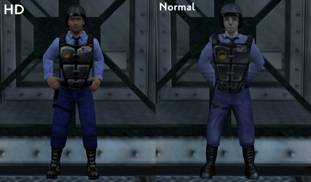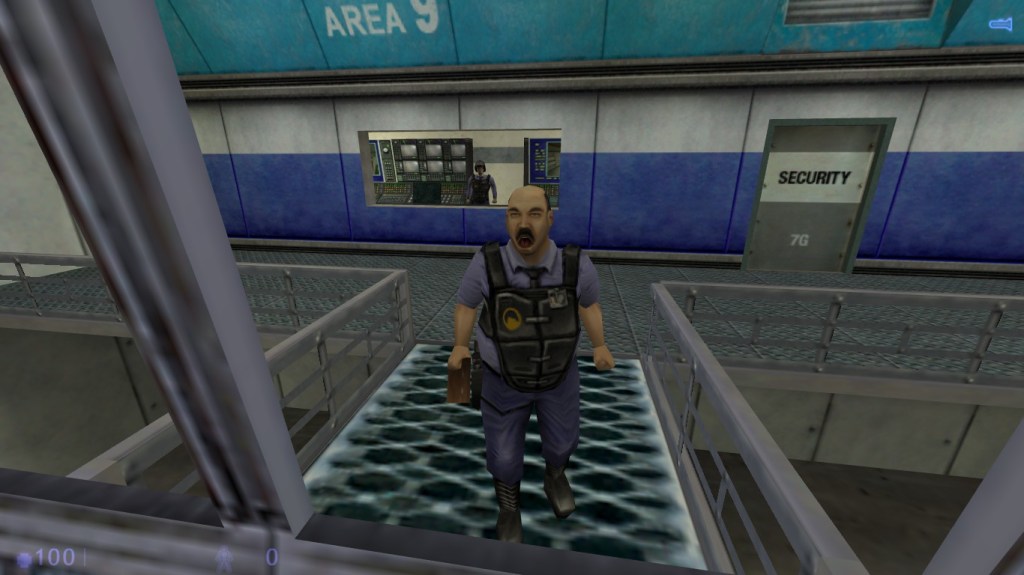 The most famous, or infamous aspect of Blue Shift is the high definition model pack it came with, which replaced numerous character and weapon models. While I don’t think this model pack should ever have automatically been applied to the other Half-Life releases as the default model set (a decision which has been undone by Steam), I don’t actually hate most of the models. The upgrade is undeniably a mixed bag. The scientists look uncanny, with their increased poly count and higher resolution textures only serving to make them look strangely smooth. Other characters however do look better. The non-prime Barney guards that the player meets do look much healthier now. While the original Barneys were pale almost to the point of ghoulishness, the HD Barneys look unbothered, moisturized, happy, in their lane, focused, and flourishing.