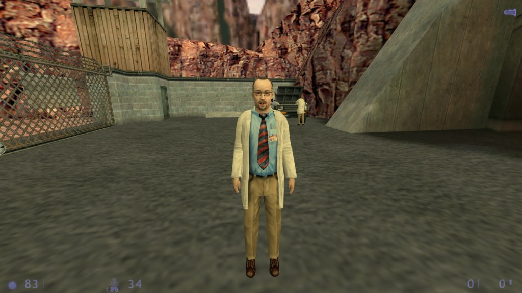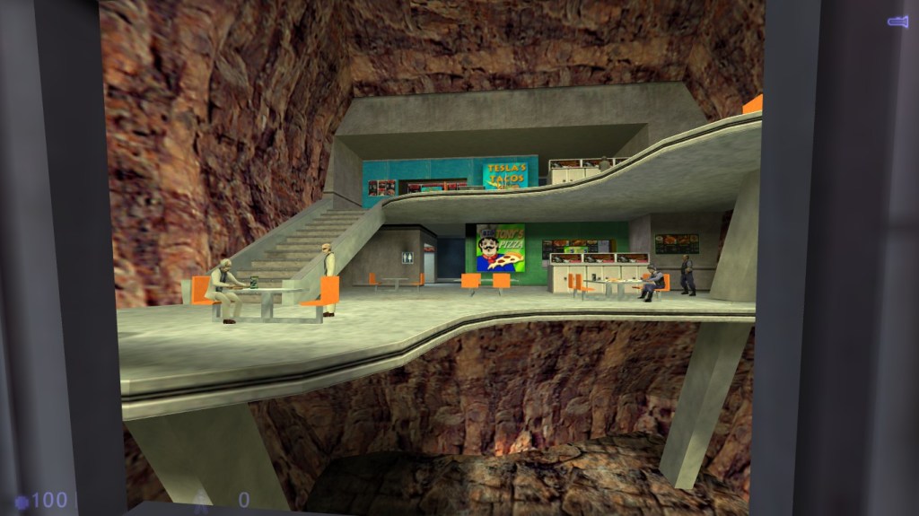 The game starts similarly to the original game, with the player on a tram heading into Black Mesa. On notable sight is a very interesting looking dining area built out of the rocks and facing the tram. It never reappears as a gameplay area which is a baffling missed opportunity.