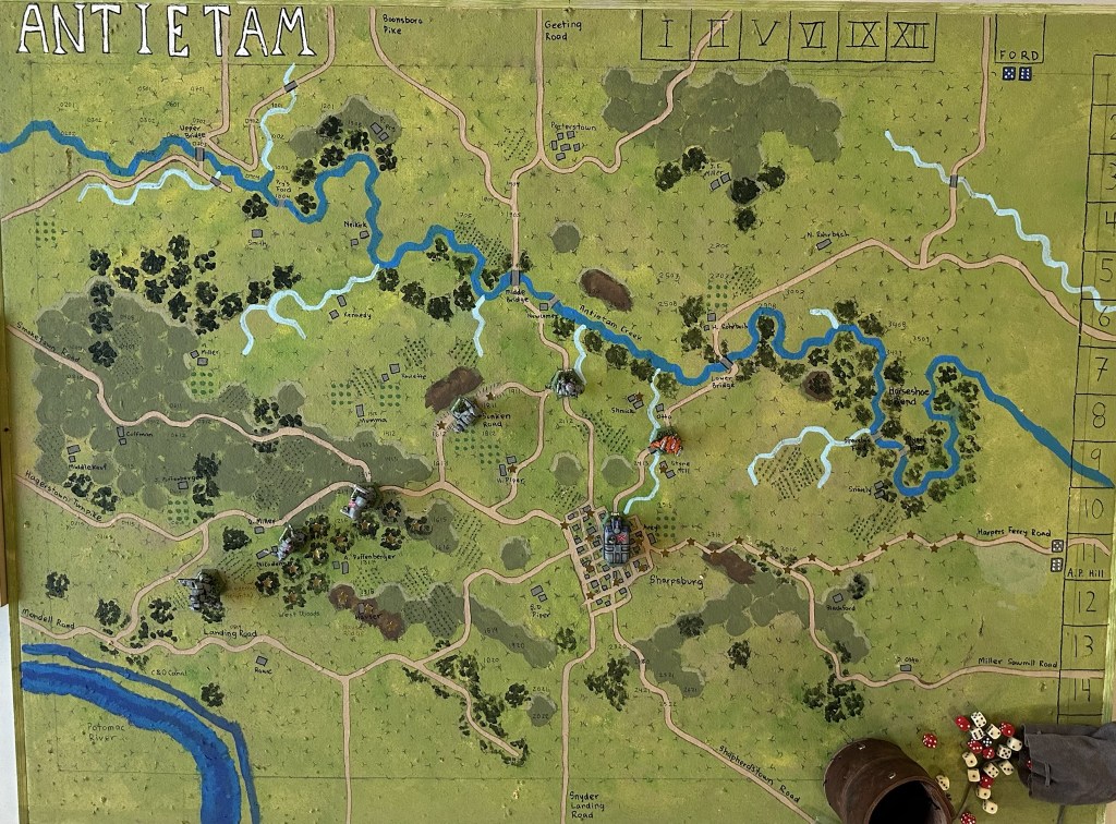 Union came on the board from the “north” (short edge of the board on the left of most photos) and “east” (long edge where Antietam is written).