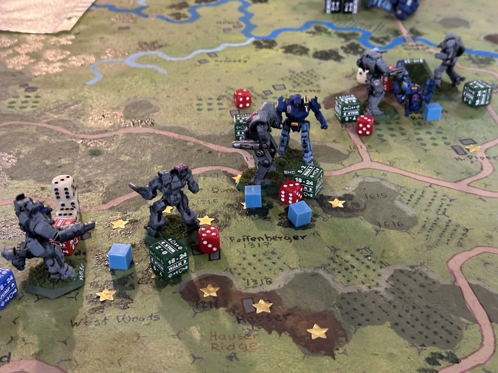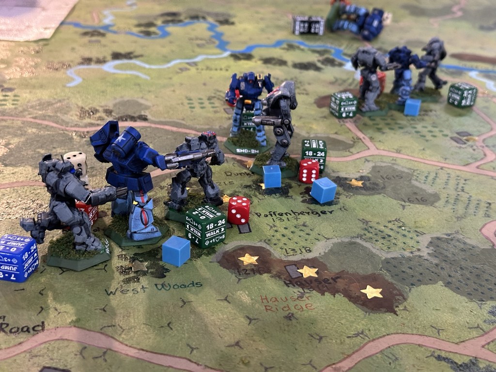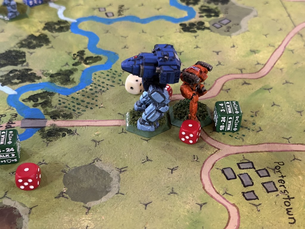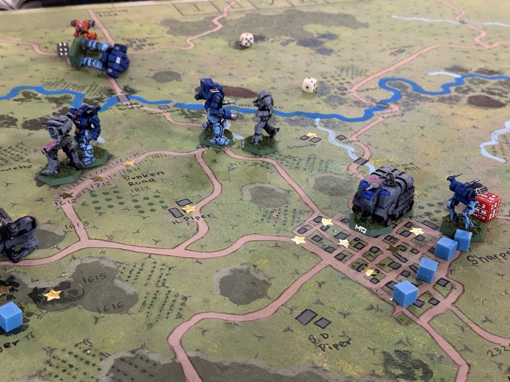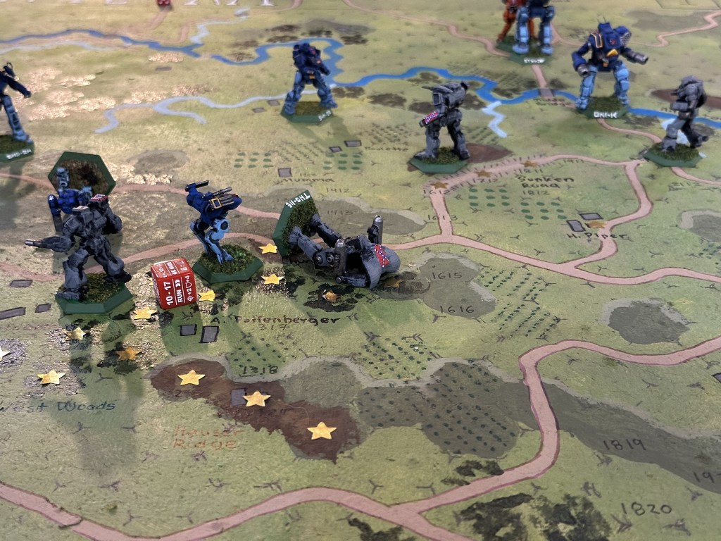 The Shadow Hawks on both sides, Union Orion, and Confederate Ostsol ended up in slugging matches. The Ostsol punched a Union Orion right in the cockpit killing the pilot, then went over to the second Shadow Hawk which had been knocked down and kicked the cockpit killing a second Union pilot on turn 6. That was the explosive finish to combat at the bottom of turn 6 which was the last of the turns we played.