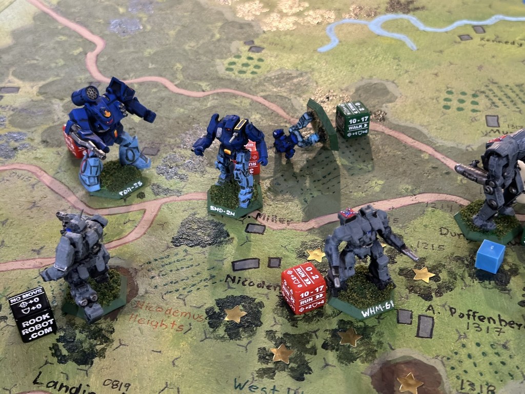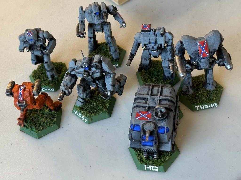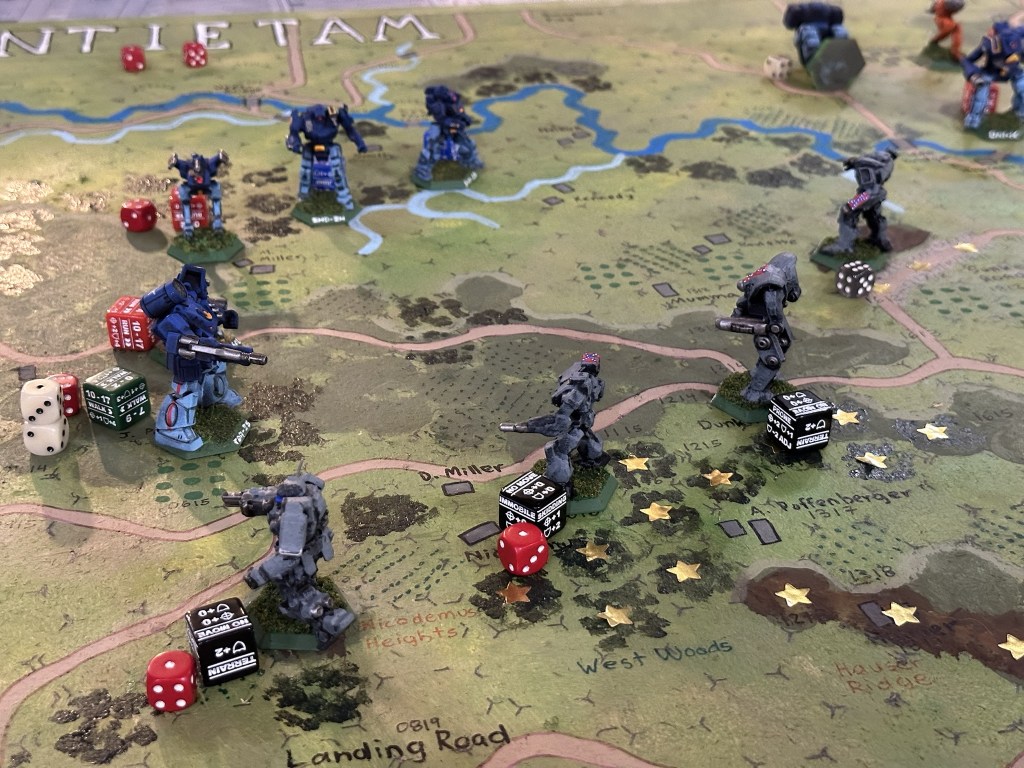 My buddy made a hex map of Antietam for use in a particular fully historical game. I saw it an immediately knew it had to be turned into a Battletech match. We made a few on the fly rule choices. Rivers on the board are drawn on hex edges so we treated them as existing on either side of the edge, with the exception of road which stayed in place as super sturdy bridges, played as roads.The original game’s scenario was played to 15 with the Union having to touch 10 hexes marked with stars to capture them and win. Confederates could retake hexes. We decided to keep these parameters.