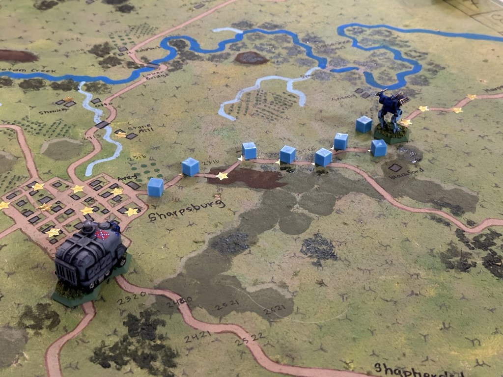 Throughout the battle, there were a lot of historical parallels throughout the game, including the Union taking higher casualties but still considering the battle a win. Historically poor Union leadership contributed to casualties and the Union player had (for purely flavor reasons) declared his general to be in the Stalker right before it got knocked out of the fight and we agreed that loss of leadership lead to his string of poor combat rolls immediately after during the initial Union assault. Locations like the sunken road and Dunken church which were historical hotspots were exactly where the heaviest mech fighting was. The poor Urbie getting both of its legs blown off couldn’t be ignored as such a sterotypical sort of Civil War wound.